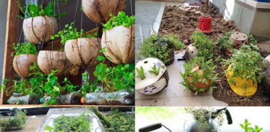 “Biến hóa” vỏ dừa, rổ rá, bô, mũ bảo hiểm… để trồng rau