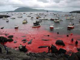 Hình ảnh bờ biển Đan Mạch nhuốm đỏ màu máu trong vụ thảm sát cá voi gây phẫn nộ trên toàn thế giới
