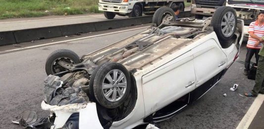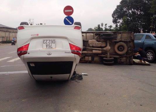 Ô tô phơi bụng, xe tải lật ngang giữa ngã ba đường