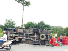 Xe tải lật, cả đoạn đường gần 20m “tắm bia”