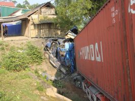 Tránh nhóm học sinh khi nổ lốp, xe container gãy gập đầu